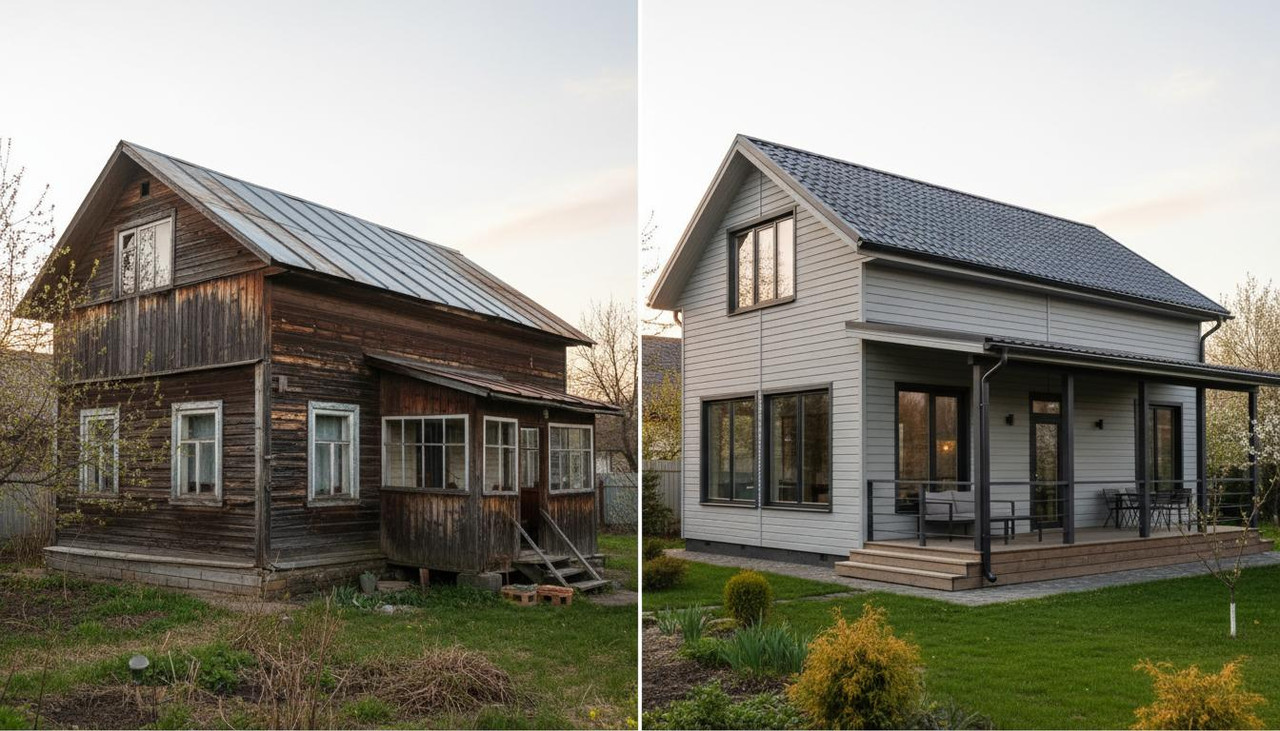 Главный критерий — состояние фундамента и несущих стен. Если основание дома прочное, а стены не имеют критических повреждений, реконструкция обойдется в 2-3 раза дешевле нового строительства.